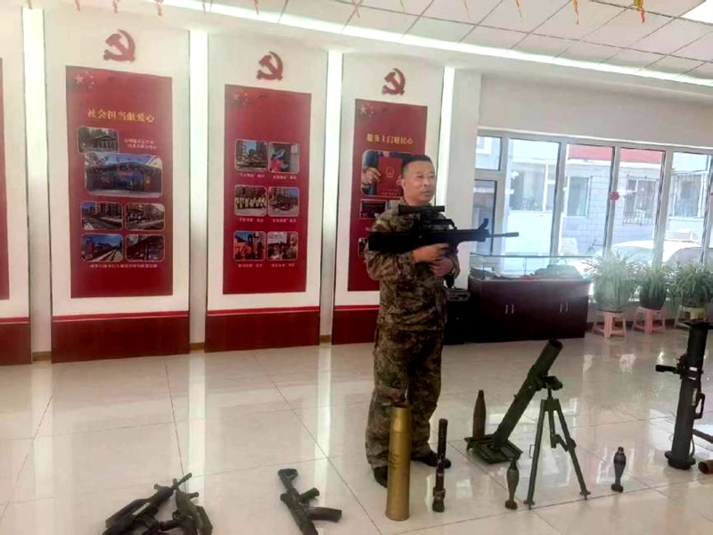 活動現場,仿真軍事裝備整齊陳列,吉林省佳德國防教育基地董事長趙振平詳細介紹裝備性能、作戰用途及國防意義。