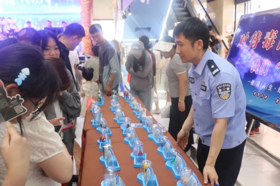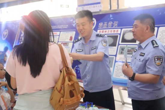 “原來這就是冰毒”“毒品原來有這么多種”“這么些種類毒品太可怕了”……伴隨著現場輕揚音樂,展臺前吸引了越來越多的市民朋友們駐足觀看。一位帶著孩子的年輕媽媽牽著女兒的手湊近展臺,眼神中滿是警惕:“警察同志,現在這些毒品偽裝得五花八門,我們做家長的該怎么教孩子識別???”民警立刻從展板上取下一張 “新型毒品偽裝圖鑒”,耐心解釋道:“您看,這種彩色小顆?!恰?、包裝精美的‘止咳水’,都可能是毒品。平時要多和孩子強調,來歷不明的東西一口都不能碰?!闭f著,還遞上一本圖文并茂的兒童版禁毒手冊,小女孩睜著大眼睛,認真翻看著手冊上的卡通禁毒故事。人群中,幾位白發蒼蒼的老人也擠到前排,其中一位拄著拐杖的大爺感慨:“現在的毒品比我們那時候狡猾多了!”民警趕忙扶住大爺,笑著回應:“大爺,您可得把今天學到的知識帶回去,給街坊鄰居都講講。有些不法分子專門騙老年人,把毒品偽裝成保健品,咱們得多留個心眼!”大爺聽后連連點頭,小心翼翼地把禁毒宣傳冊塞進上衣口袋。