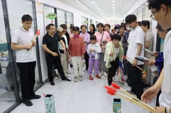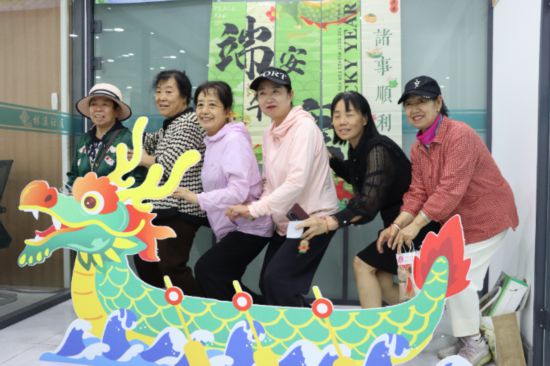 五彩絲線編織端午安康,投壺競技重現古人雅趣。社區書記周峰親手將帶有美好寓意的五彩繩系到居民的手上,這不僅是節日祝福的傳遞,更是社區與居民心脈相連的溫情紐帶。 最具人氣的當屬"龍舟拍照打卡區",在充滿節日元素的場景中拍照留念,通過社交平臺分享傳統文化魅力。投壺區也不時傳來為同伴喝彩的爽朗笑聲。