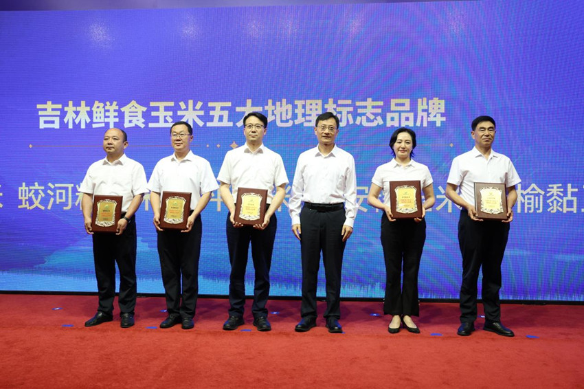 吉米金穗“五大經典”評選頒獎授牌,圖為吉林鮮食玉米五大地理標志品牌獲獎代表領獎