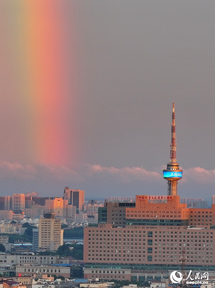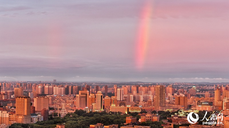 7月20日傍晚,長春市上空現大面積“火燒云”和雙彩虹景觀?;馃茖⑻炜杖境梢黄燃t,晚霞滿天,蔚為壯觀。