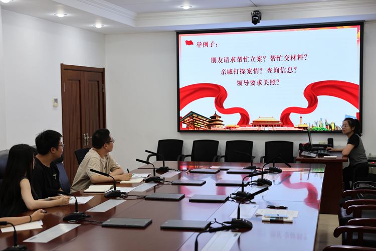 政治部副主任熊哲言以《入職第一課——廉政教育》為題,警示新入職公務員要樹立正確的價值觀和權力觀,時刻繃緊紀律之弦,堅守廉潔自律的底線?!胺ㄔ菏蔷S護公平正義的‘最后一道防線’,而廉政是必須用一生堅守的‘底線’——從入職第一天起,就要把‘廉潔’二字刻進骨子里、融入行動中?!?/p>
