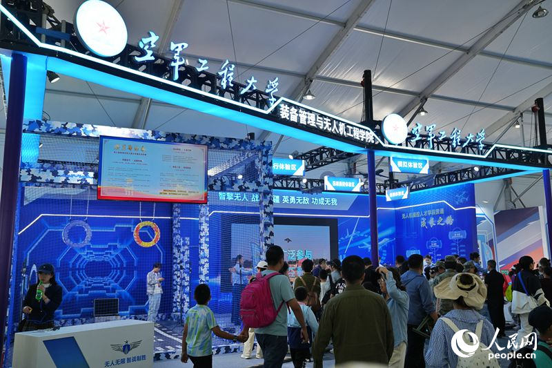 位于航空展無人智能館的空軍工程大學展區,集中展示了該校無人機領域的教學思路和創新成果,旨在激發、培養青少年對無人機的興趣與熱愛。