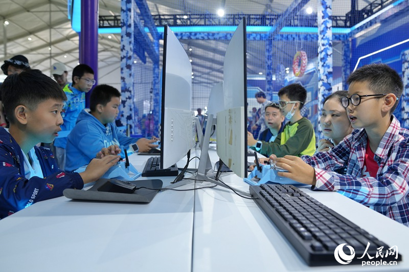 步入展區,集群矩陣飛行、遠控互聯展示等“智能蒼穹”系列表演十分吸睛,空中競技體驗、深空障礙穿越等沉浸式體驗則吸引了不少青少年踴躍參加。自航空展開幕以來,該展區持續火爆,為了體驗該校先進的無人機項目,不少家長帶著孩子早早就來排隊等候,工作人員在一旁耐心指導。