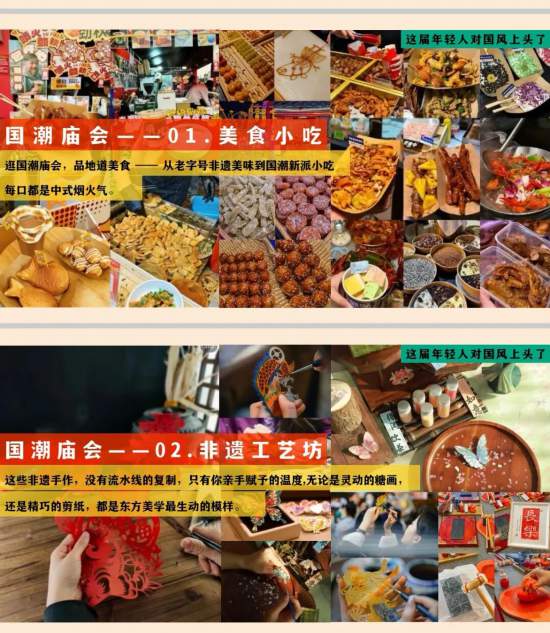 主干道兩側攤位超吸睛!老字號非遺美味、國潮新派小吃滿足舌尖渴望;面塑、草編、葫蘆畫等非遺手作能親手體驗,還有非遺食品、國風小飾品等你來淘。
