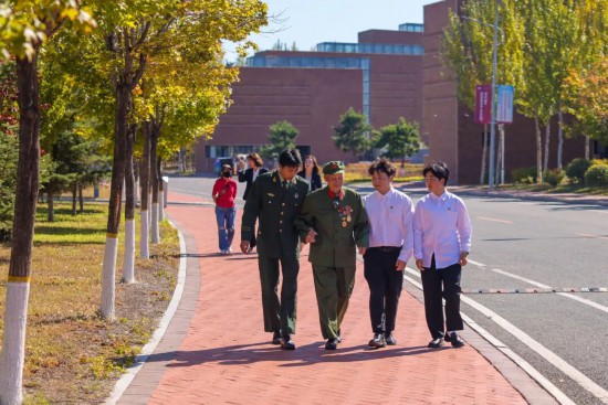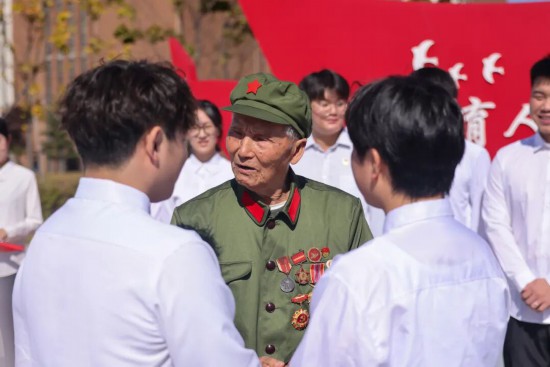 活動尾聲,知行廣場上出現了令人熱淚盈眶的一幕:金融學院金融學24501班退役大學生管延碩,向楊秀友老戰士敬上標準的軍禮;老人緩緩抬手,顫抖卻有力地回禮。兩代軍人,跨越70余年時光的敬禮,讓在場師生爆發出雷鳴般的掌聲。這不僅是軍人榮譽的傳遞,更是紅色精神的接力——老一輩用生命守護的信仰,正被青年一代穩穩接住。