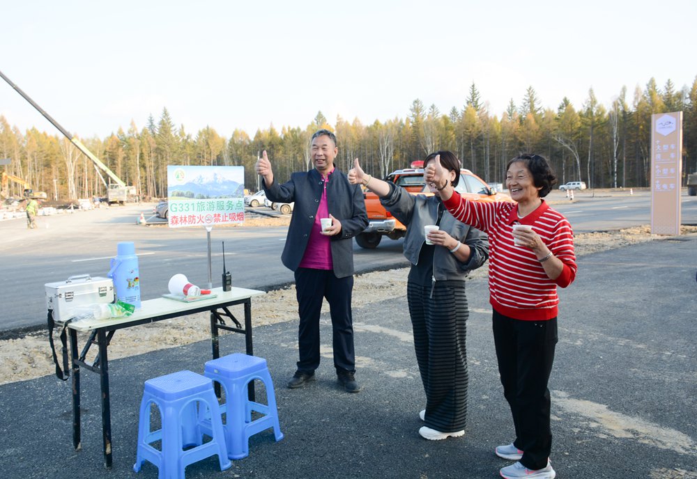 林區檢查站,已成為溫馨的休憩點,為游客們“加油充電”,暖意融融。鋪著格子桌布的餐桌、擺放整齊的木椅、窗邊冒著熱氣的熱水箱和免費紙杯、Wi-Fi、衛生間等,細節處盡顯用心用情,全方位為游客提供周到的服務。室內溫暖如春,室外熱情似火?!皝?,大姐,給您續上熱水!”一位防火員正俯身從粉色保溫壺中,為一位女游客手中的保溫杯添熱水。在另一處停車場,一群橙色制服的消防員忙著用保溫壺為游客倒水,陽光灑落,水汽氤氳,歡聲笑語間,防火知識的種子已悄然播撒。