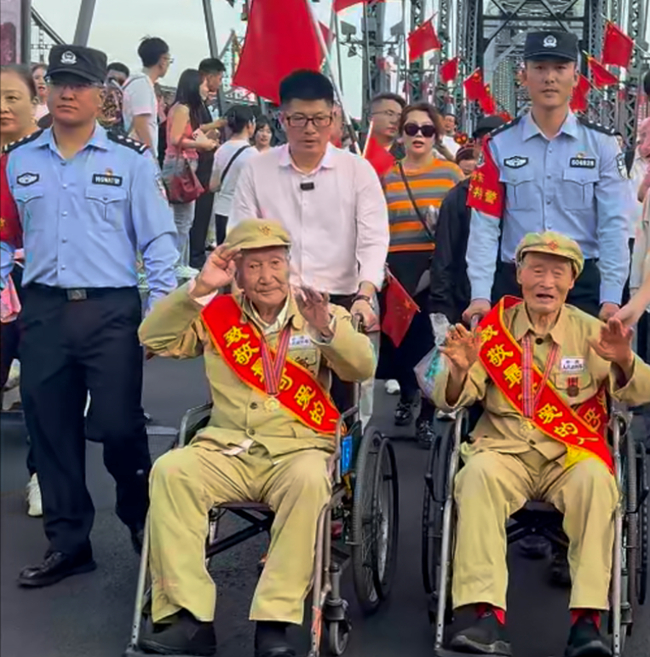 身著曾經穿過的軍裝、胸前掛滿勛章的老兵們在家屬和工作人員的推扶下來到鴨綠江畔。他們不時駐足凝望,輕撫橋身,眼中泛著淚光。鴨綠江斷橋景區得知老兵們到來消息后,組織了歡迎隊伍,交警為老兵們開路,景區工作人員主動靠前為老兵們服務。游客們手持國旗,自發響起掌聲,向老兵們致以崇高敬意,不少人情不自禁地唱起了《中國人民志愿軍戰歌》?,F場游客紛紛上前與老兵握手,孩子們圍在身邊追問當年的戰斗故事,老兵們沙啞的講述聲里,炮火硝煙仿佛重現眼前。老兵們舉行了簡樸而莊嚴的祭奠儀式,98歲的抗美援朝老兵趙志新布滿皺紋的手輕撫著斑駁的橋梁,淚水順著溝壑縱橫的臉頰滑落:“老伙計,我來看你們了?!?/p>